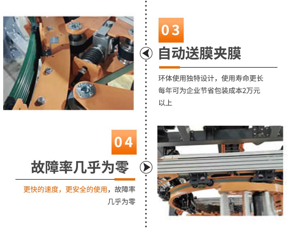 配有傳輸線 操作系統(tǒng),高效簡單 多達36個包裝選項可供選擇 應用靈活,方便高效 光電開關檢測貨物高度 為企業(yè)節(jié)約包裝成本 包裝方式可任意選擇 允許薄膜防止薄膜松動 速度更快,使用更安全,故障率幾乎為零 環(huán)體采用獨特設計,使用壽命更長 自動送膜夾膜,自動焊膜,無膜尾 |