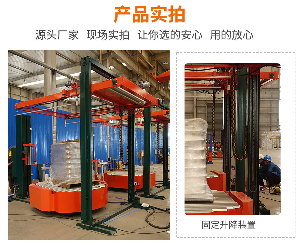 覆頂裝置自動啟動,通過升降機(jī)將膜降到貨物頂部,將塑料薄膜卷放在升降架的排膜輥上,排膜輥通過電機(jī)和鏈輪鏈條帶動旋轉(zhuǎn),