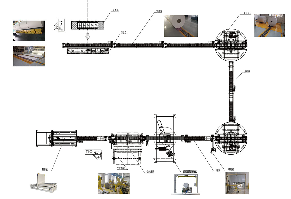 工藝流程:復卷機臺下來的紙卷-止動分配器-氣動擋紙器-鏈板輸送機-電動轉(zhuǎn)盤-稱重裝置-自動噴碼機-自動貼標機-自動捆扎機(纏膜)-豎身升降機